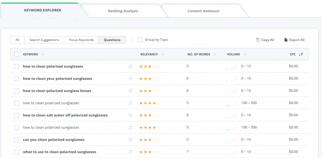 The Keyword Explorer – this section is great for keyword analysis and discovering new keyword opportunities. It also gives you the possibility of seeing only the question suggestions. Get inspired by the list of questions, check out the relevancy of the question, its volume, CPC (cost per click), and choose the one that is the most suitable and profitable.