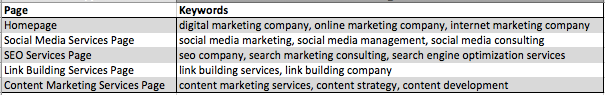Chances are during your keyword research, you ended up with about 5 – 10 main keyword phrases that you want to target. For example, a digital marketing agency may discover the following keywords and match them as follows.