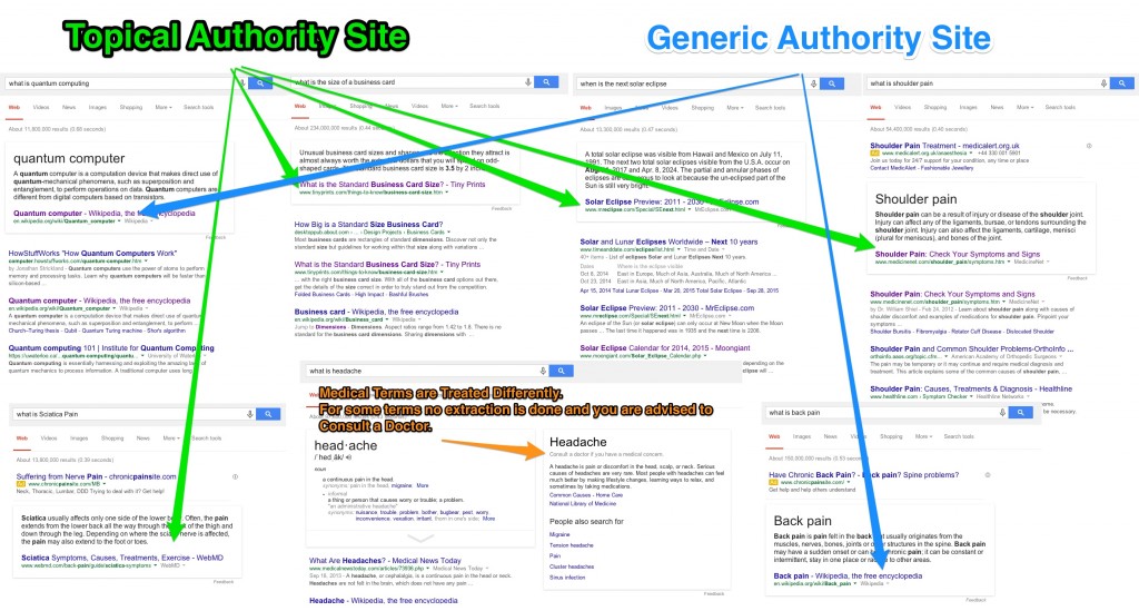 Therefore, it seems like that for more specific queries, content based Topical Authority Sites are quoted more in answer boxes compared to sites that only cover the topic briefly (even if the site covering the topic briefly has a lot of generic authority).