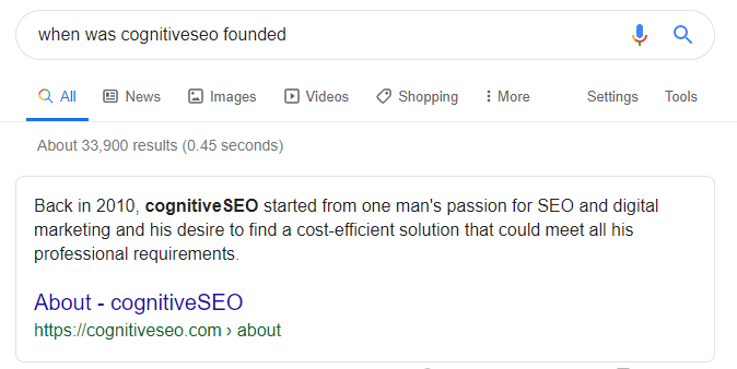 Let’s take for instance the first case. From the “about” page from cognitiveSEO we get the info about when the tool took birth. When it comes to the second example, Google decided that the most relevant data for the BrandMentions tool was not the site’s “about” page, but a third party website that made a review on that tool. The founding data of BrandMentions can be found on its site as well, yet, Google found it easier probably to extract it from another source.