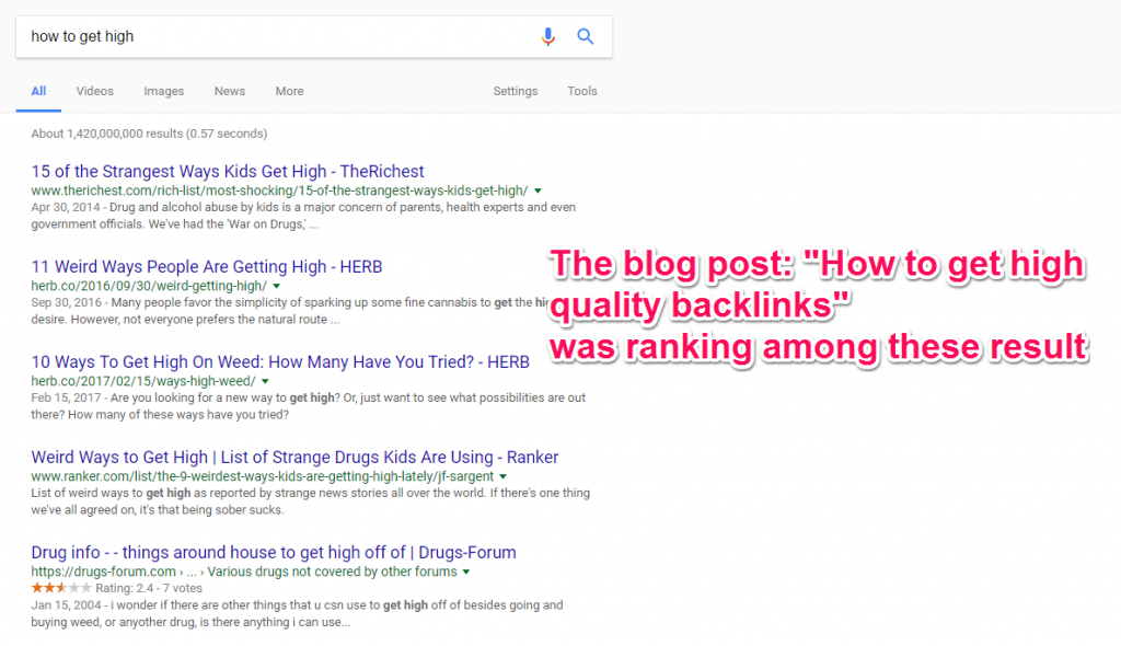 However, the mentioned article ranked not only for “high quality backlinks” but also for the keyword “how to get high.” As interesting and as comic the situation was, we believe that the author didn’t intend to compete for this keyword; yet, there it was ranking amongst strange recommendation of getting high, with or without drugs.