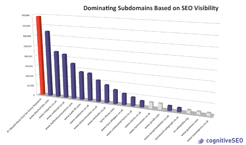 We’ve excluded from the analysis the companies that you see marked in grey color in the chart above. And this is not because we don’t like those websites but because they don’t match the UK tire niche. Pirelli, for instance, has the .co.uk version but doesn’t even make the cut in top 20. We’ve also excluded Wikipedia page and also some websites that don’t directly produce or sell tires but are more sort of product comparators.