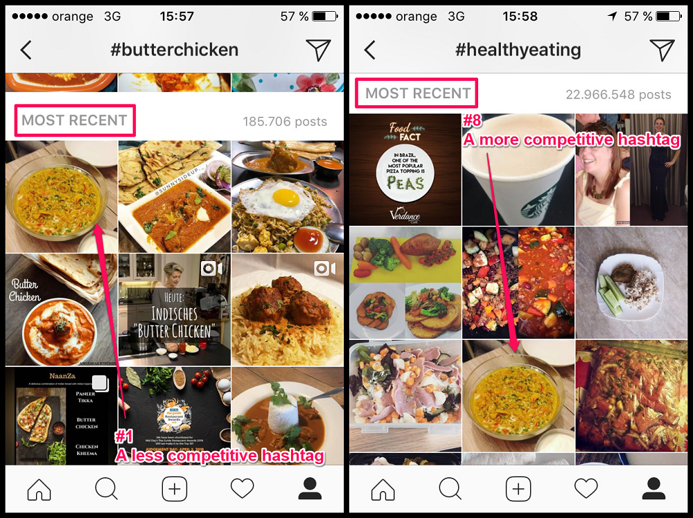 Instagram is a little bit easier to navigate, especially when looking at the “Most Recent” section of a hashtag page. I conducted an experiment by posting a random photo from my phone on Instagram using the #healthyeating and #butterchicken hashtags. And voila! They appeared in the Most Recent section. However, in the second screenshot, my post didn’t show up in the top three posts but was instead pushed down by others. The reason? That particular SEO hashtag is highly trending, so new posts appear just seconds apart.