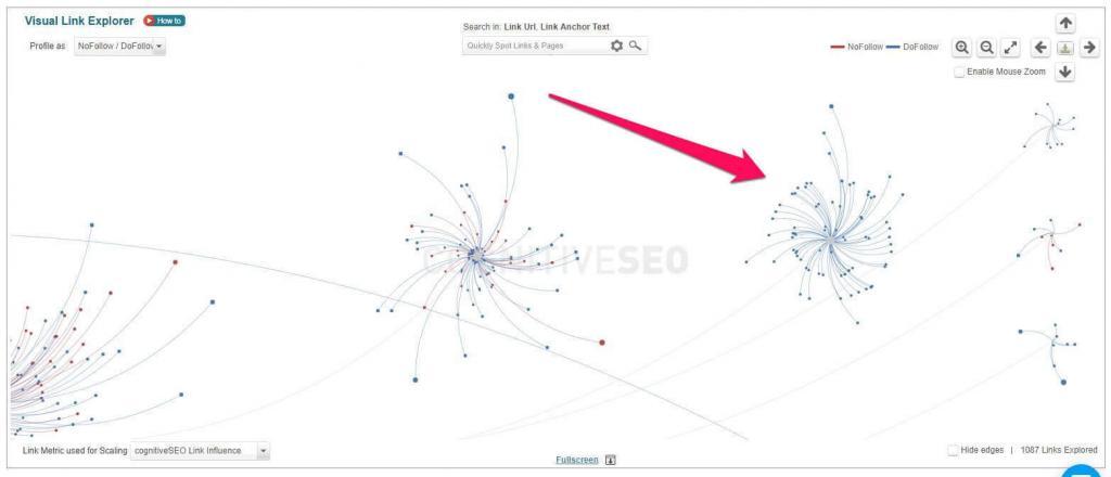 If your link profile is natural, you’ll probably also have a smaller number of nofollow links. There are more chances that an unnatural link profile will have more dofollow links, as their webmasters will try to build more of those. Here is an example from an analysis we made on the spammy links of a page that has only dofollow links to it (the cluster in the right, with blue lines only ). Shady, right?