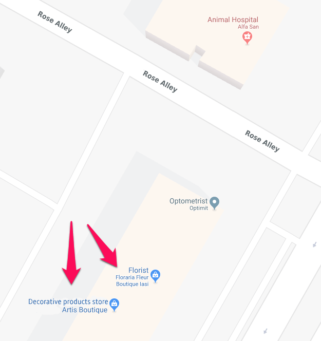 They both have the same address, one of them has contact information and photos, while the other has nothing. The explanation, in this case, is simple. At this specific address was Artis Boutique, then they moved and another florist took its place: Fleur Boutique.