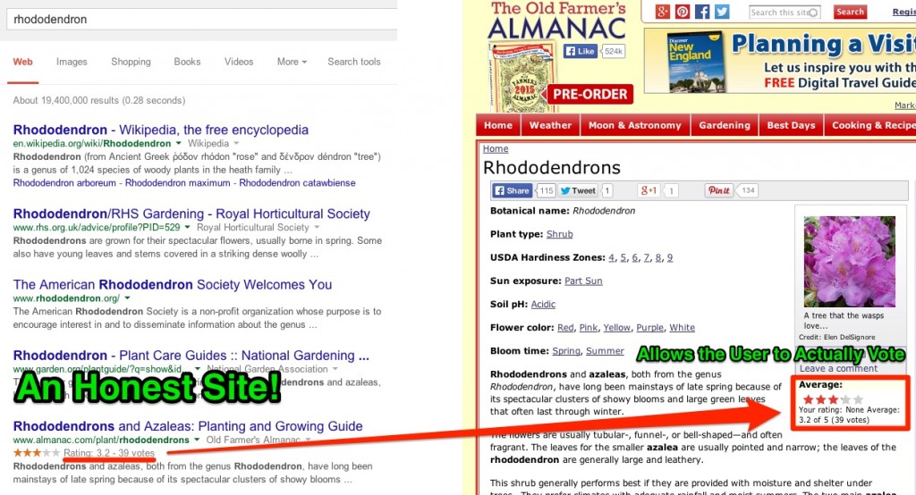 I present you another perfect example of a honest review rich snippet seen in the wild. It appears on the “rhododendrons” keyword. You can see it has a fairly good rating coming from 39 votes, displayed in the search results. But in contrast to the abused rich snippets presented earlier, this rich snippet data corresponds with the data from the site. As you can see, the website has a voting mechanism in place that allows users to actually vote. That’s the most important part. In many cases of abused rich snippet cases, webmasters used information that couldn’t be correlated with anything from the website. And some of them were penalized accordingly.