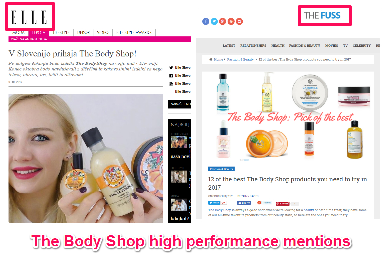 Most likely everyone heard of Elle, the worldwide lifestyle magazine…or at least anyone interested in the fashion – cosmetics niche. What you need to know about it is that this publication is a well-known and popular magazine worldwide. So, having a mention here could be compared with having links from .edu websites. Even though The Body Shop does not not excel in terms of the volume of mentions when compared to its competitors, it’s doing OK when it comes to qualitative mentions.